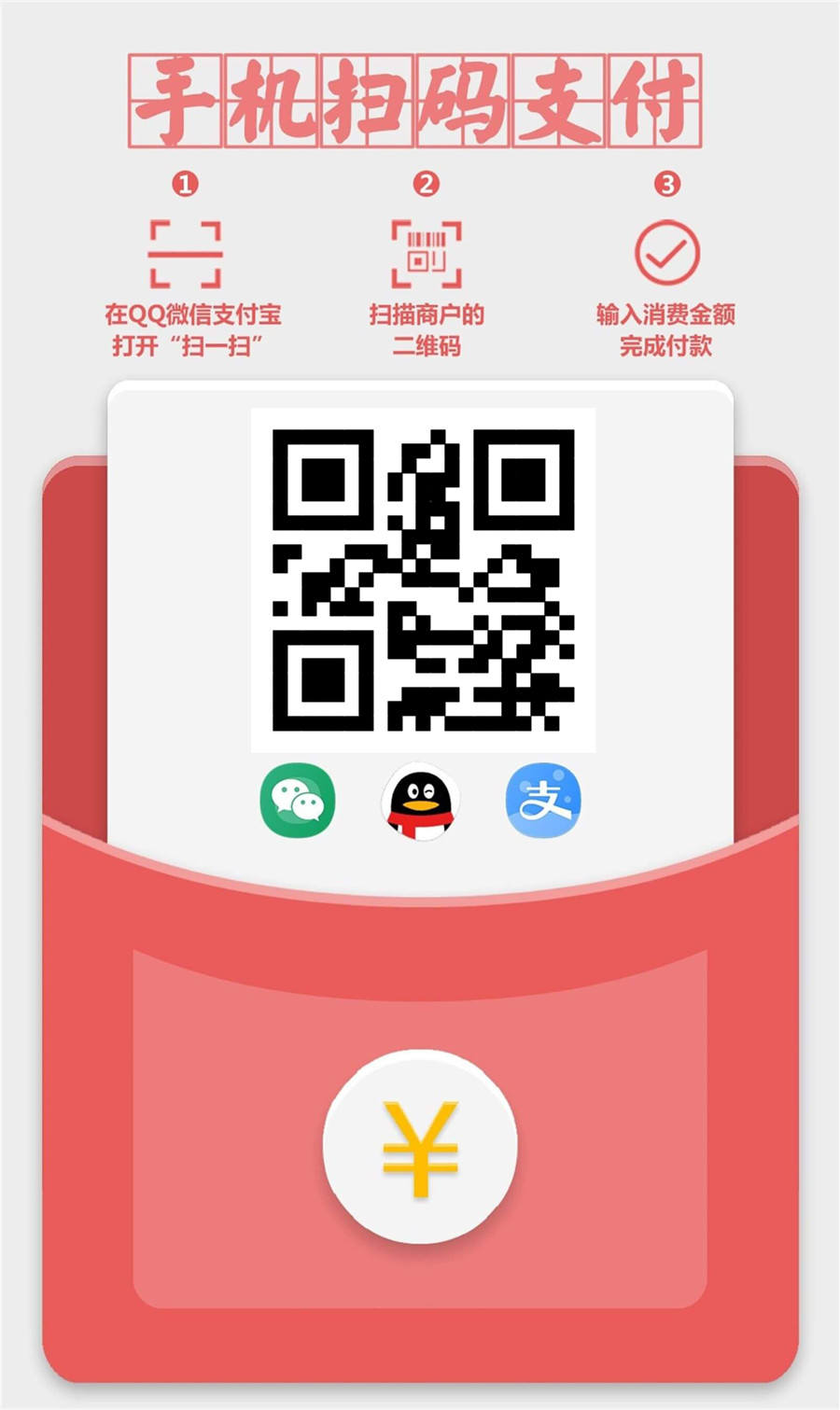 将微信收款码、QQ收款码和支付宝收款码合并为一个二维码,用户扫码后直接付款给商家,无需手续费。
